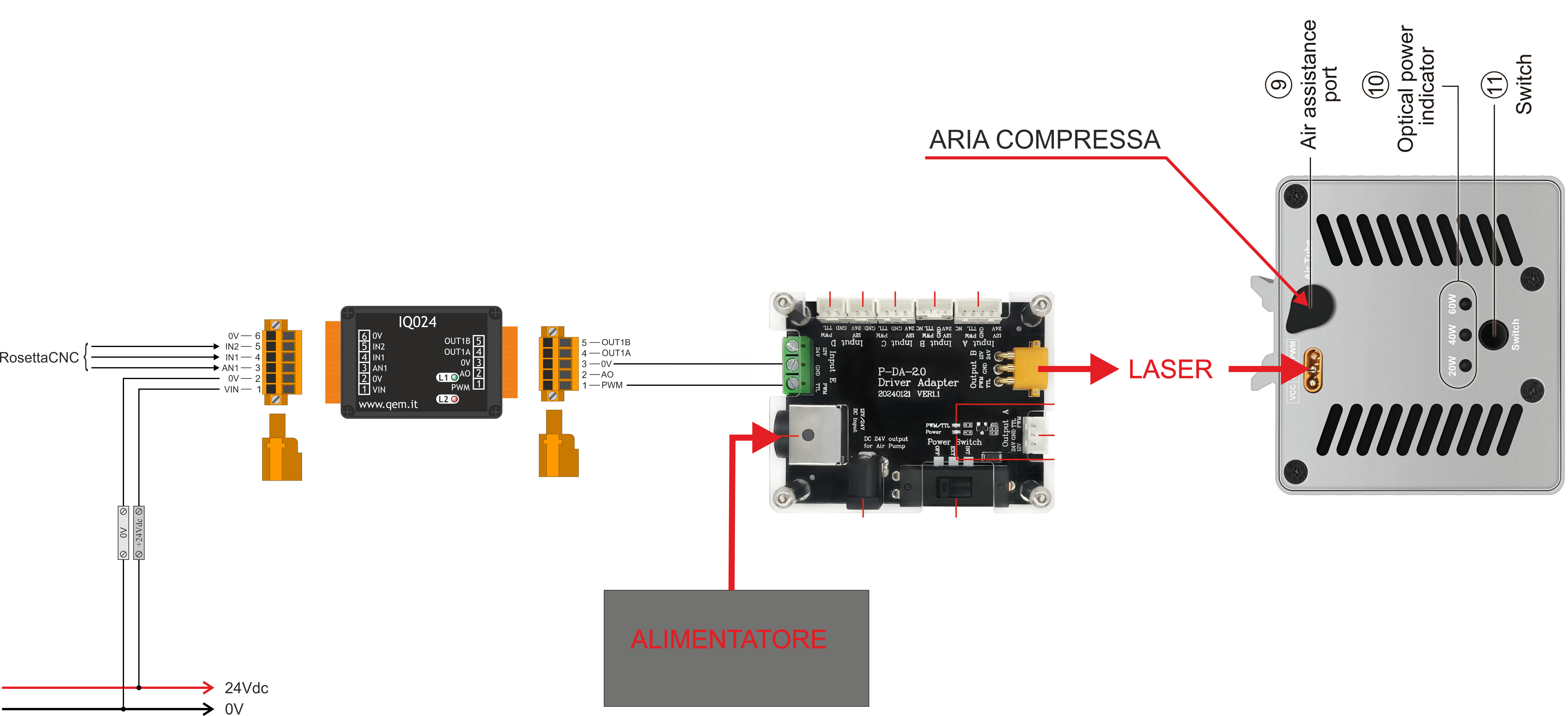 Prima di maneggiare lo strumento, togliere tensione e tutte le parti ad esso collegate.L'IQ024 viene alimentato con una tensione nominale di 24Vdc ai pin 1 e 2 di CN1.