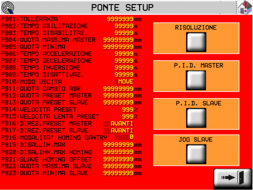 PB19 : DISALLIN.MAX | mm | 1 | 0 ÷ 999999.9 | Disallineamento (mm) massimo tra asse ponte master e asse ponte slave prima di mandare la macchina in allarme. |