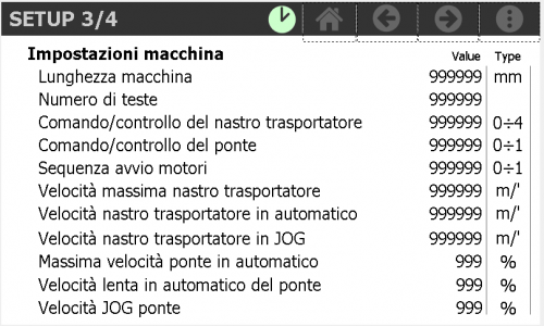 Nome parametro Unità di misura Valore iniziale Range Descrizione Lunghezza macchina mm 0 0÷9999.9 Lunghezza della macchina (misurando dal sensore di lettura pezzo alla fine della macchina) Numero di teste 1 1÷19 Numero totale di teste utilizzate Comando/controllo del nastro trasportatore 3 0÷4 0= si legge la velocità
