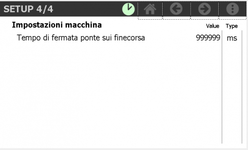0=indietro \ 1=avantiTipo ingresso carter 0 0÷1 0=Normalmente Chiuso (NC) \ 1= Normalmente Aperto (N.O) Suono strumento 0 0÷1 0=suona alla pressione di pulsanti o tasti \ 1= non emette suoni Setup macchina